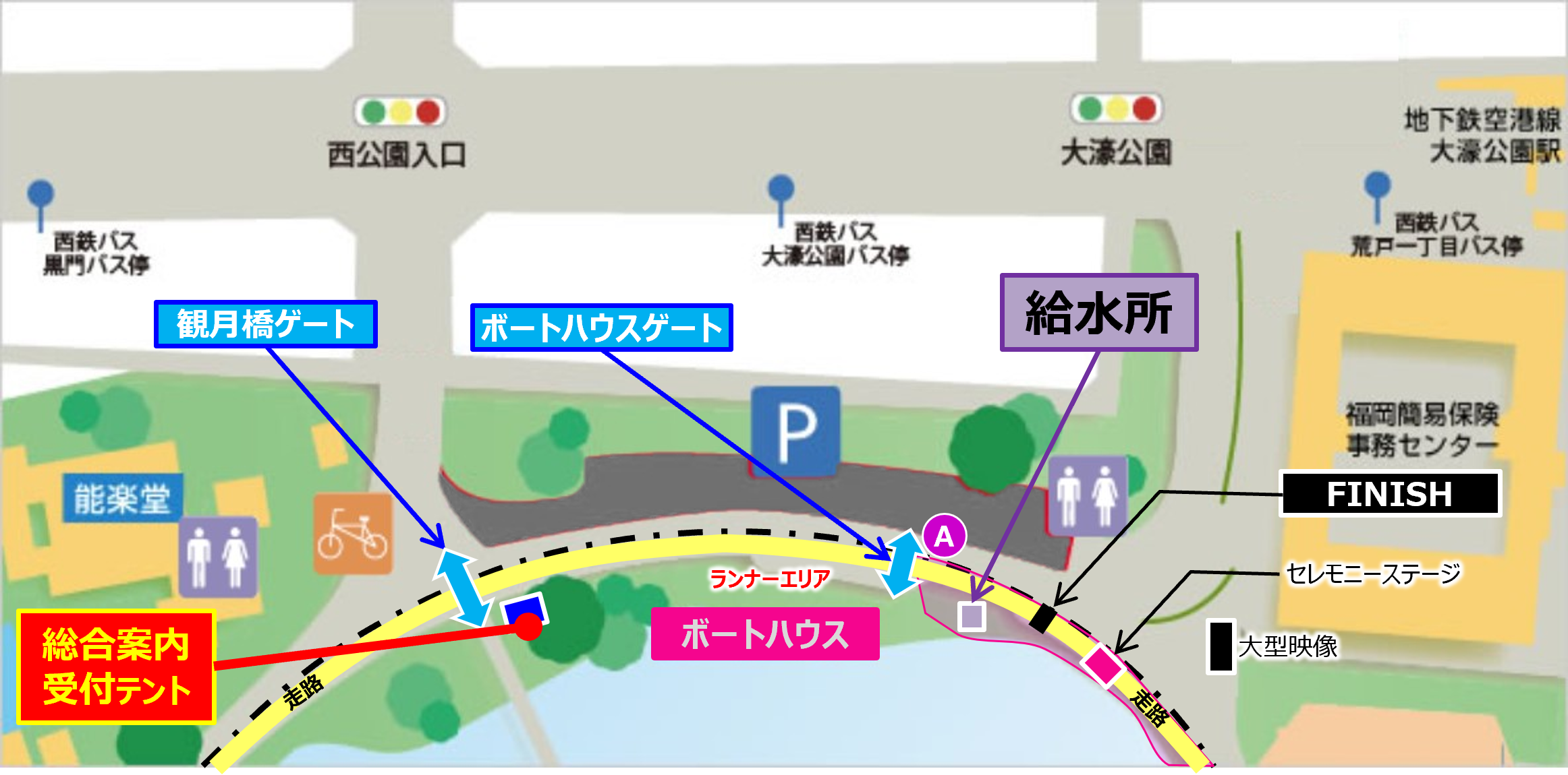 大濠公園内では所定の場所【ランナーエリア内歩道】【レースのない時間帯のコース内】で行ってください。